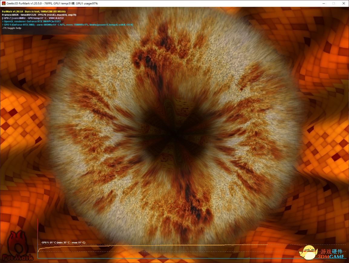 接下来进行显卡的10分钟满载测试,得出结果如下:显卡在满载运行10分钟的情况下,非常稳定的维持在了51度的范围内。对比起一些厚重的游戏本,这个成绩已经与它们拉开了非常明显的差距。对于一些以60-80度为标准的游戏PC,G-ONE无疑是再次提高了业内的散热标准,做到了极致散热。