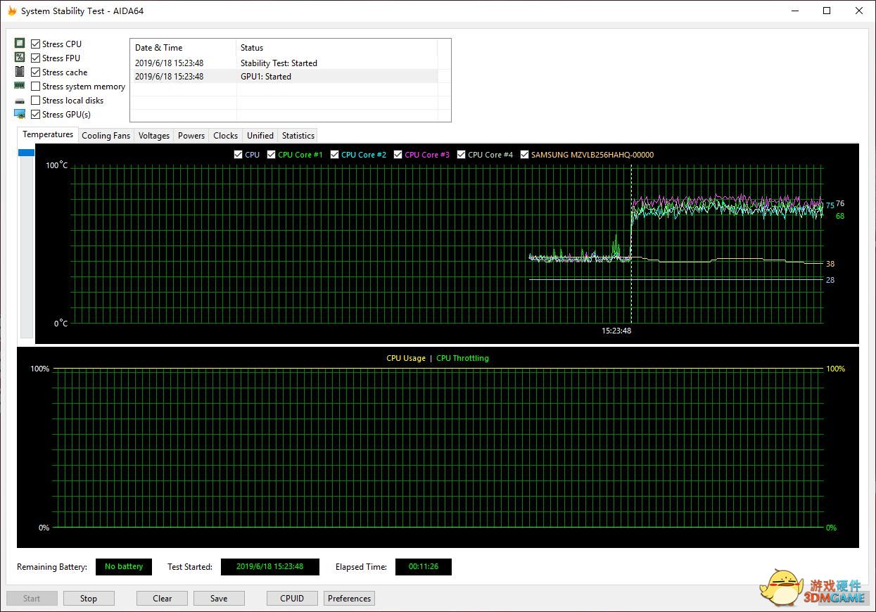 经过十分钟的拷机测试之后,得出结果如下:CPU在满载运行10分钟的情况下,维持在了75度左右的优秀成绩。要知道一些用上了水冷的台式机,在十分钟拷机环境下一般都是80度左右。得意于强大的散热模块设计,G-ONE对CPU的温度控制取得了非常优秀的成绩。