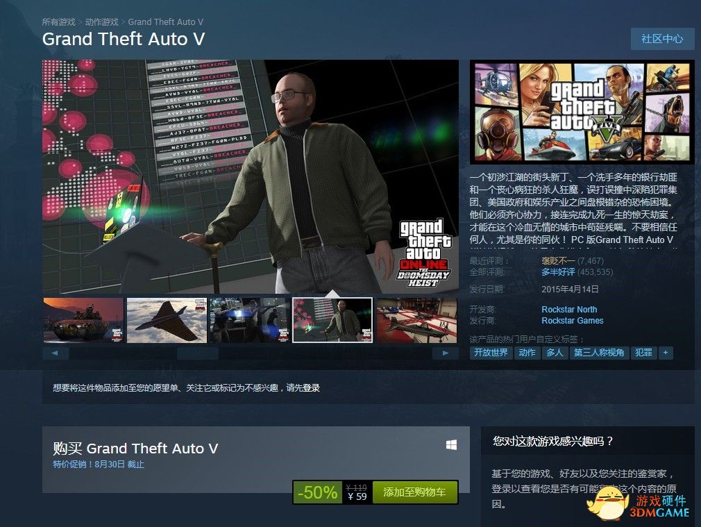 它来了,它来了,它带着半价走来了~日前《GTA5》在STEAM上以半价59元优惠促销,截止日期至2019年8月30日。这不禁又让人想问一个问题,究竟是谁还在买《GTA5》?销量周榜榜首预定一波~