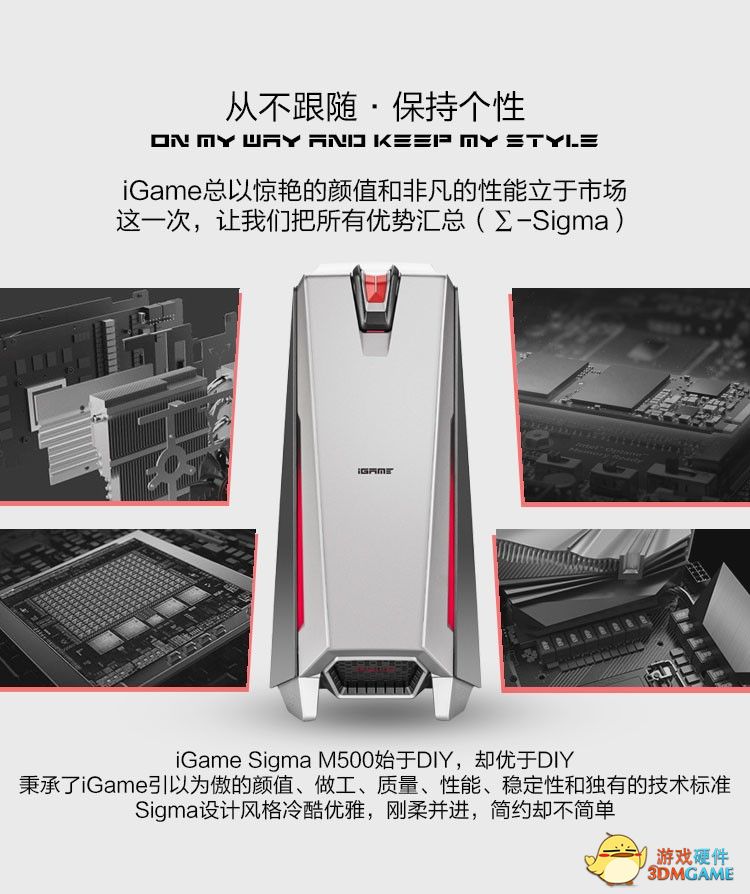 全新iGame Sigma M500游戏台式机基于七彩虹iGame在DIY市场的经验积累和技术优势衍生出的首款成品类台式机,在产品介绍中毫不逊色的打出“细节值得被专业者推敲”的口号,挑战多年来关注更专业的DIY用户对整机产品苛刻的要求。采用6面设计的M500涵盖了多达9大设计亮点,最突出的可数全包围6面设计,罕见的熏黑式渐变灯饰以及仪式感强烈的开关按钮。