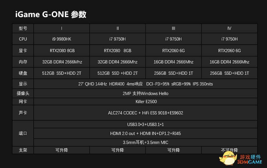 iGame G-ONE新推出的四款配置在前一代的基础上将CPU全部升级为英特尔酷睿九代处理器,带来更为快速流畅的游戏体验。最高可搭载i9-9980HK, 单核最高5GHz睿频,双核4.9GHz睿频、四核4.8GHz睿频以及8核4.7GHz睿频,九代酷睿i9相较前代游戏帧数提升18%、4K视频编辑提升28%、游戏串流/录制帧数提升2.1倍。媲美桌面级处理器的性能,电脑运行更为流畅,游戏加载无需等待。显卡方面依然是RTX 2060 起步,强力组合,高调出击。此次推出的配置有 i9-9980HK RTX 2080(可升降支架)/ i7-9750H RTX 2080(可升降支架)/ i7-9750H RTX 2060(可升降支架)/ i7-9750H RTX 2060(不可升降支架)四种配置供玩家选择。