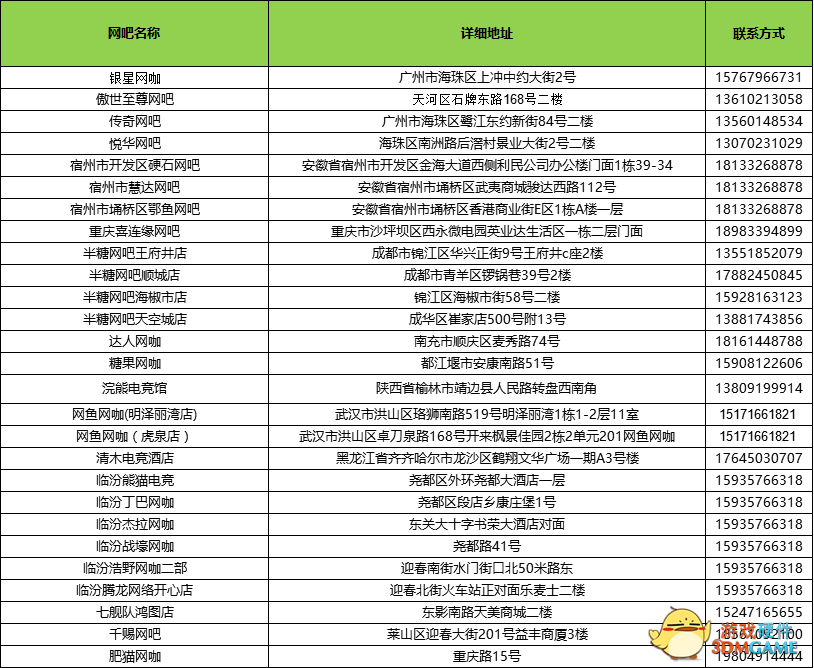 除了这两家网吧以外,参与此次【七彩虹&NVIDIA高端网吧体验】活动的25家网吧中也均可以体验iGame品牌显卡系列的产品,以下是所有参与此次活动的网吧地址,感兴趣的玩家们可选择自己所在城市的网吧进行体验。