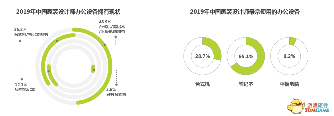 对于轻薄便携的需求,是因为设计师工作环境极其复杂,既需要在安静的室内环境中作图实现创意,又需要面对客户进行交谈与作品演示。这也导致了如今有超过84.2%的设计师都拥有台式机、笔记本和平板电脑三种设备,其中以轻薄便携为特点的笔记本为最常用的办公设备。