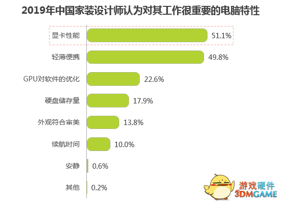 据艾瑞咨询数据调研,影响设计师购买电脑的最重要因素是显卡性能,有超过50%的设计师认为显卡的性能是最为重要的一点。其次,便是电脑的轻薄便携,也有近50%的设计师认为这对于工作很重要。这两方面成为现代设计师们首要的考虑因素。