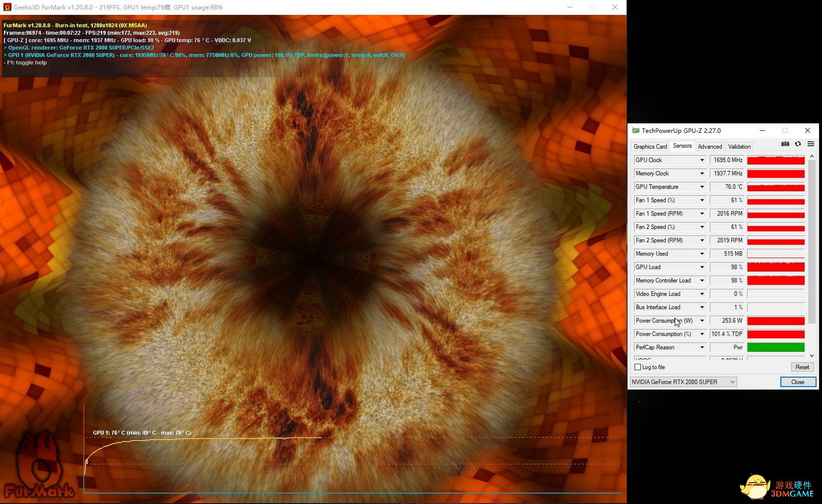 索泰RTX2080super 至尊PLUS OC极限烤机的功耗已经达到250W,温度控制在76℃,整体噪音比较小。