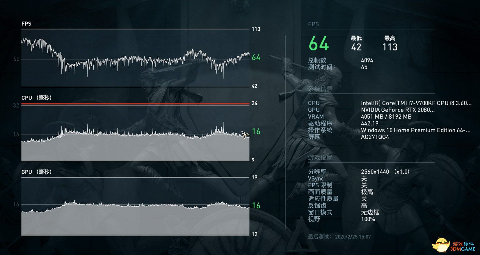 众生平等的刺客信条-奥德赛在2K极高画质模式下达到流畅以上的64fps。