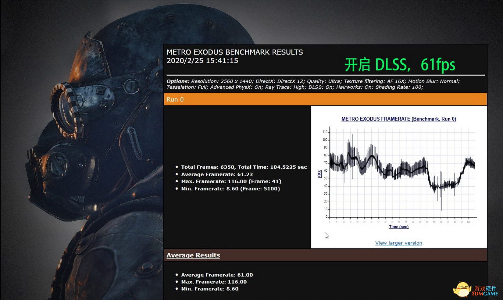 光追杀手级游戏《地铁离去》,2K下开启RTX和DLSS刚好达到61fps。