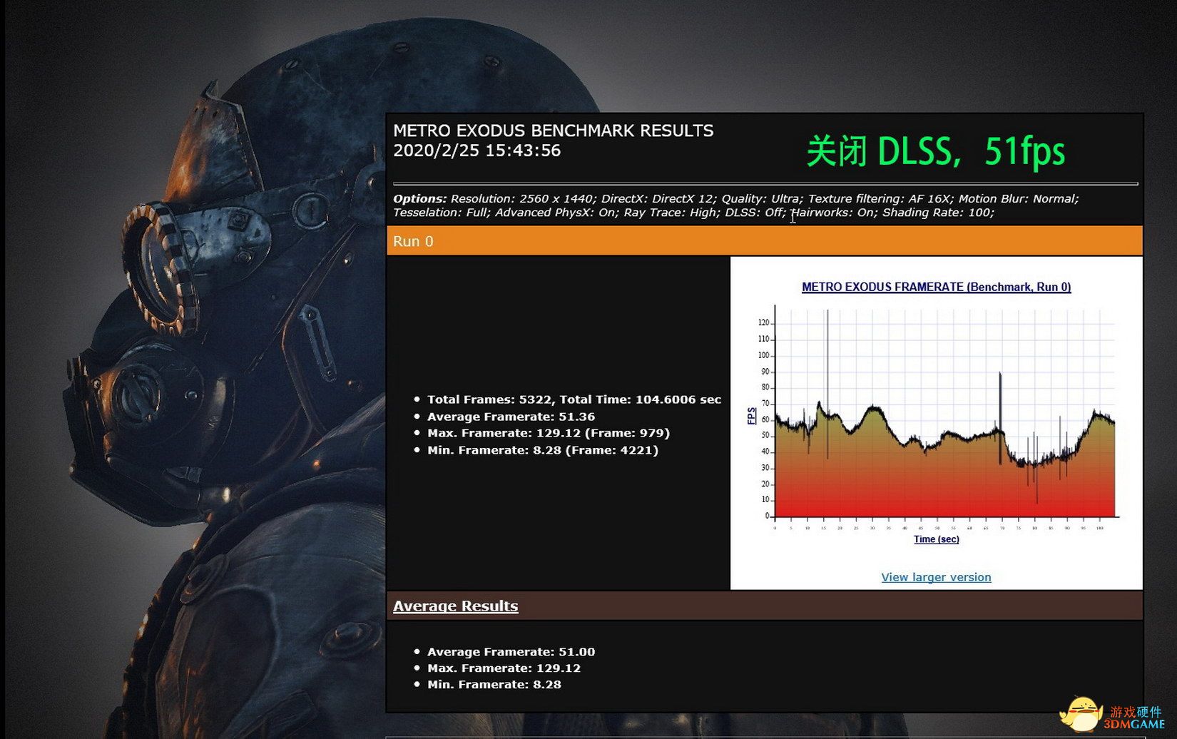 开启RTX然后关掉DLSS则跑出51fps,看来DLSS这个黑科技在RTX模式下加成还蛮大,直接提升了20%的帧数。