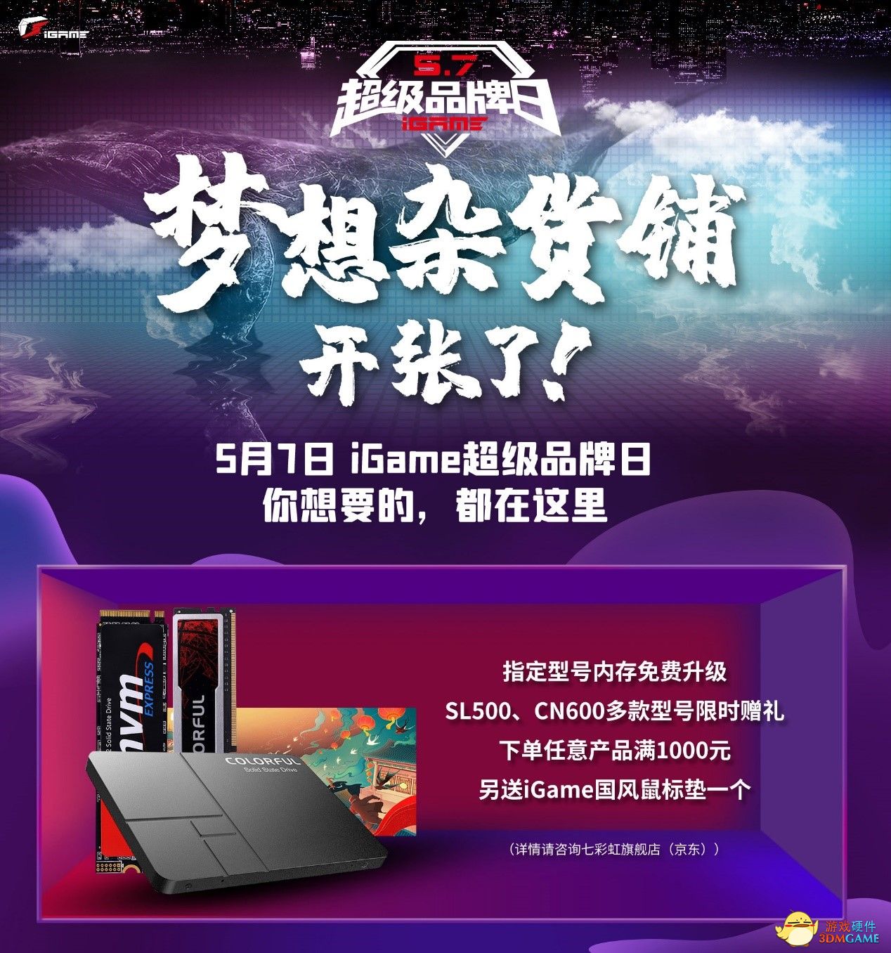 “超级白日梦”免单活动,iGame超级品牌日期间(5月7日至5月8日),在任意店铺购买了七彩虹旗下的SSD、内存产品的用户,均可参与共10个名额。