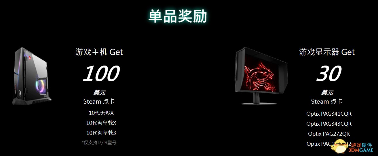 其中,购买微星10代无烬X、海皇戟X、海皇戟3等游戏主机单品即可获赠100美元的Steam点卡,而购买微星旗下Optix PAG341CQR、Optix PAG343CQR、Optix PAG272QR、Optix PAG272QR2等游戏显示器单品亦可获得30美元Steam点卡的奖励;