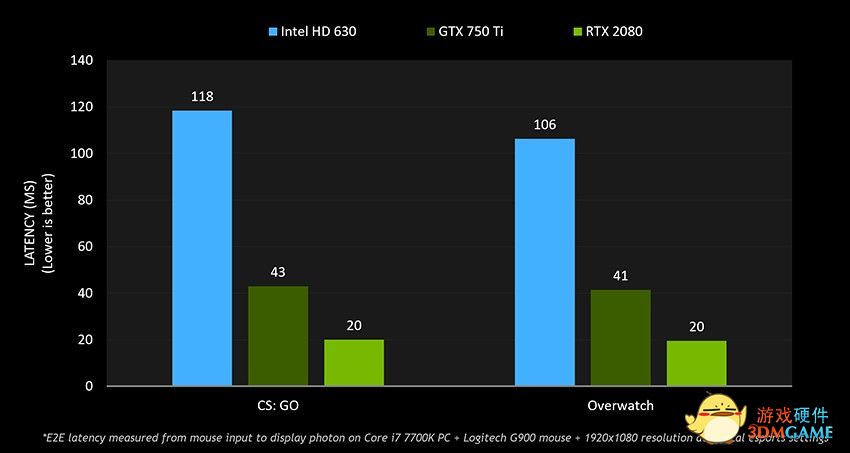在现代游戏中,“游戏引擎”、“Direct X Render”和“GPU”都有相同的延迟。GPU 速度越快,这三个过程所需时间越短,玩家就能越快在屏幕上看到更新后的图像,从而做出反应。因此,GPU 是降低延迟最重要的因素。下图为不同 GPU 工作时,系统端到端延迟的变化。