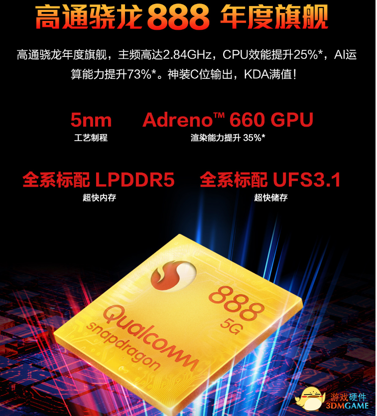 此外,腾讯ROG游戏手机5全系搭载了目前最新的高通骁龙™ 888 5G移动平台,其基于先进的5nm工艺制程,CPU效能提升25%,图形渲染性能获得了惊人的35%提升,即使是要求最苛刻的大型3D游戏,也能在最高画质下流畅运行。