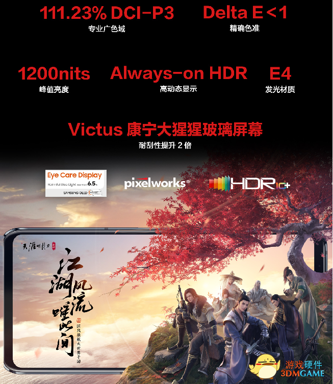 同时,腾讯ROG游戏手机5系列还覆盖了有史以来最坚固的康宁®大猩猩®玻璃 Victus™保护屏幕,耐刮性提升2倍,为这块定制版Amoled屏提供安全保障。
