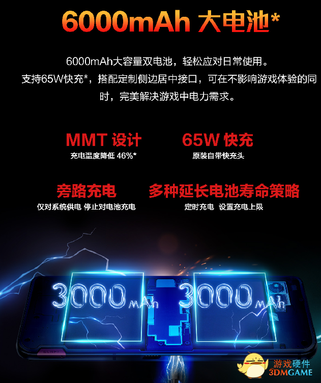 腾讯ROG游戏手机5搭载6000mAh大容量双电池,支持65W快充,足以帮助玩家轻松应对日常使用。在横屏游戏过程中,定制侧边居中接口可在不影响游戏体验的情况下为手机提供动力,旁路充电设计允许玩家设置仅对系统供电,停止对电池充电,边充边玩舒心安全。MMT设计使充电温度有效降低约46%,同时手机还拥有多种延长电池寿命的策略供玩家选择,持久战斗依旧战力澎湃。