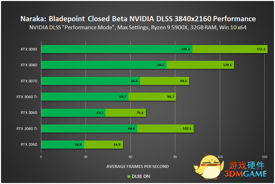 · 24 Entertainment的《永劫无间》(Naraka: Bladepoint) - 备受期待的以近身战斗为重点的大逃杀游戏在最近推出的封闭测试中添加了对DLSS支持。在4K分辨率下带来高达60%的性能提升。在DLSS的加持下,在4K分辨率下开启最高设置,所有GeForce RTX 30系列的玩家都能以60 FPS+的帧率享受游戏动作。