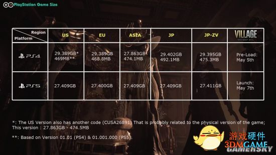 今日推特账号“PlayStation Game Size”曝光了全球各个地区《生化危机8:村庄》PS版容量,其中PS4版约为29.4GB(亚洲地区约为27.8GB);PS5版约为27.4GB。