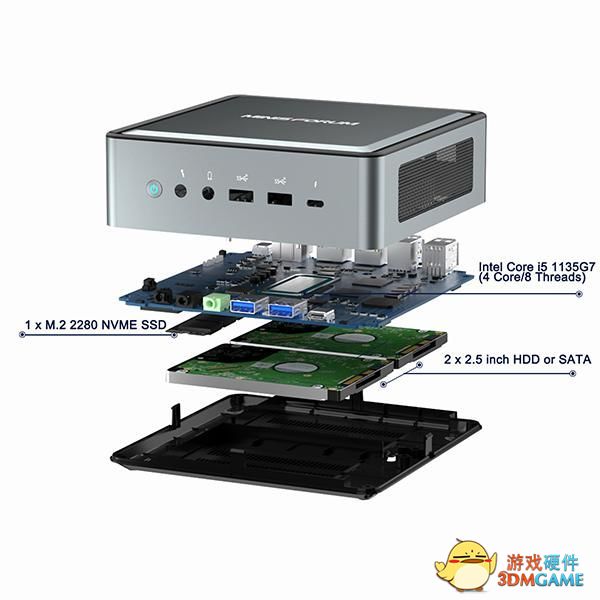 存储方面,其可搭配 DDR4-3200 内存 + PCIe 4.0 NVMe SSD(可选 512GB ~ 2TB),足以应付一些繁重的游戏和视频编辑任务。机身结构设计很是简洁,后续可轻松升级相关配置,比如加装两块 2.5 英寸 SATA HDD 。