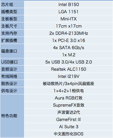 主板选择了华硕B150I PRO GAMING WIFI/AURA,首先强调一点的是选择小钢炮机箱的人多是对外观有强烈的要求的,所以灯光自然少不了,而这块主板则轻松满足了这项要求。接口和规格方面笔者整理了一下做成一张图片。