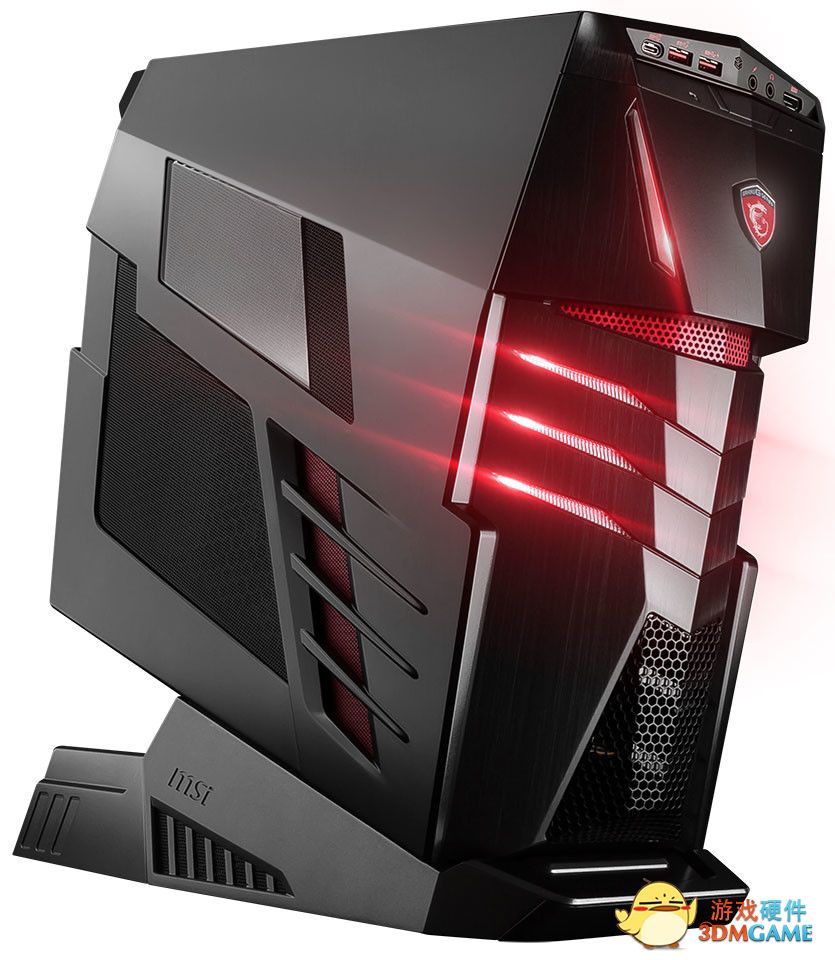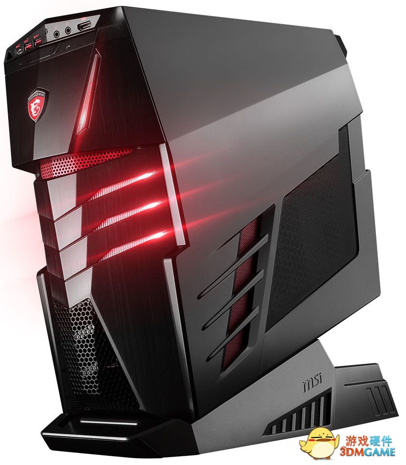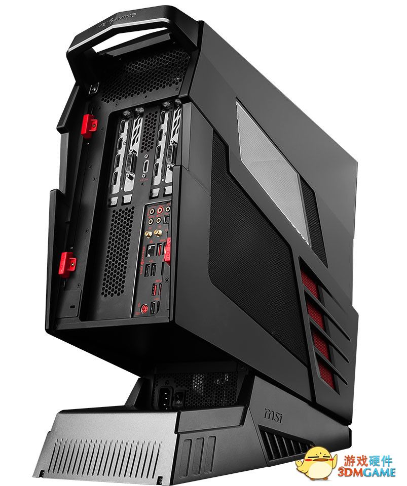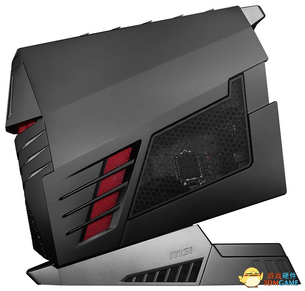 Aegis Ti游戏主机依旧保持了炫酷的外形,十分动感。电源配置在底座上,两块GTX1080安置在了顶部。