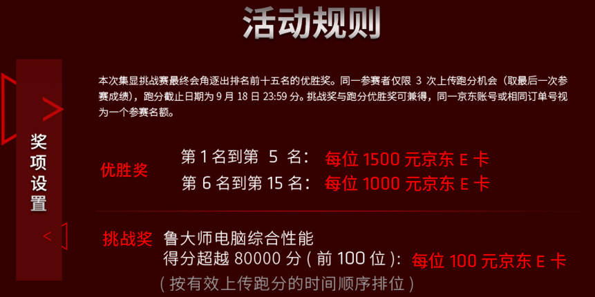除了固定排名奖之外,本次“开学季千元大奖助力!京东集显挑战赛”活动还为广大参与者提供了京东E卡奖励,凡在活动期间鲁大师综合性能得分超过80000分以上的玩家即可获得挑战成功奖——100元京东E卡(限前100位)!阳光普照、雨露均沾的奖励是您不可错过的机会。