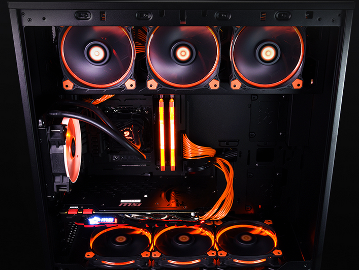 首先这款剑龙G7在外观上浑身上下充满了酷炫的气质,机箱是迎广303专门为名龙堂做的定制款。黑橙的主色调既热情又相当大方当然细节也不能放过连侧透板拉手部分都是明艳的橙色,机箱内部空间很大配色统一的橙红定制线整整齐齐,黑橙定制的一体水冷霸气高冷,橙红光圈的Thermaltake风扇威风凛凛,底部还配置了黑色的可抽插式大面积的防尘滤网可以完整的阻隔进风口灰尘与杂质方便你的清理。 真是细心又贴心。