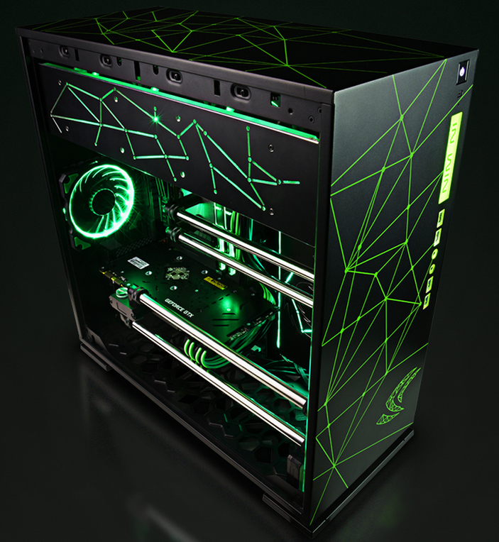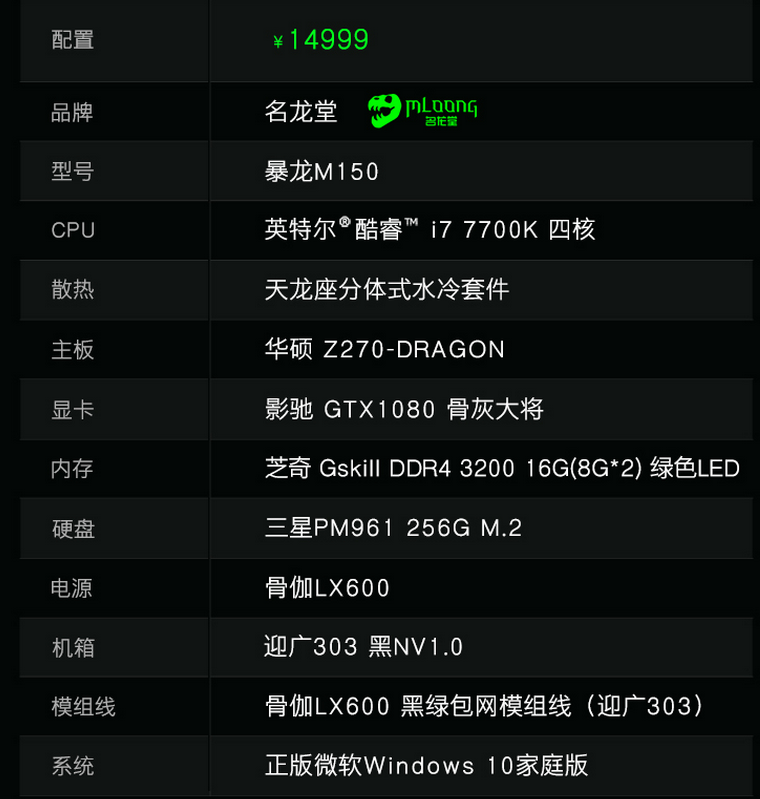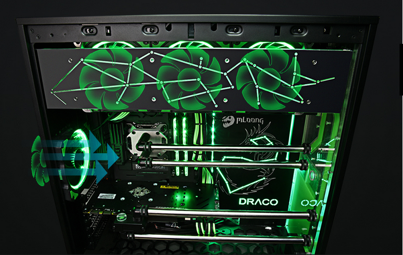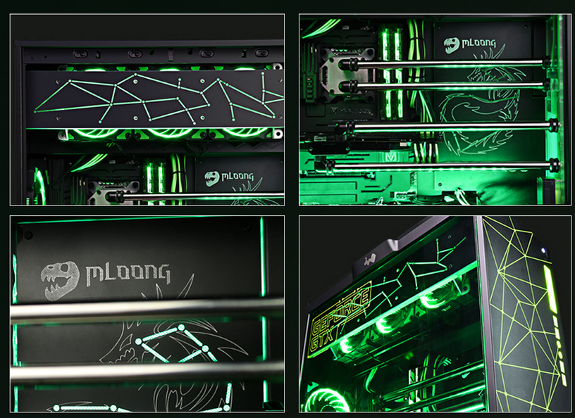 这台暴龙M150选用的是迎广303机箱无论内部的部件和定制模组线还是外部机身黑绿配色考究一步到位,全身钢制磕着碰着绝对不会变形出现凹凸,黑色的漆层如同暗夜一般深邃而暗夜之上是点点相连的莹莹繁星,当绿色的LED灯开启暗夜与绿光相映成辉,是不是透过这神秘的绿光就能触碰到向往已久的信仰之魂?内部的灯板,铭牌,跟机箱一样采用线性设计,无形之中相互交融,直指星座中的天龙座,别出心裁的名龙堂的LOGO与天龙座星座坐标相得益彰。