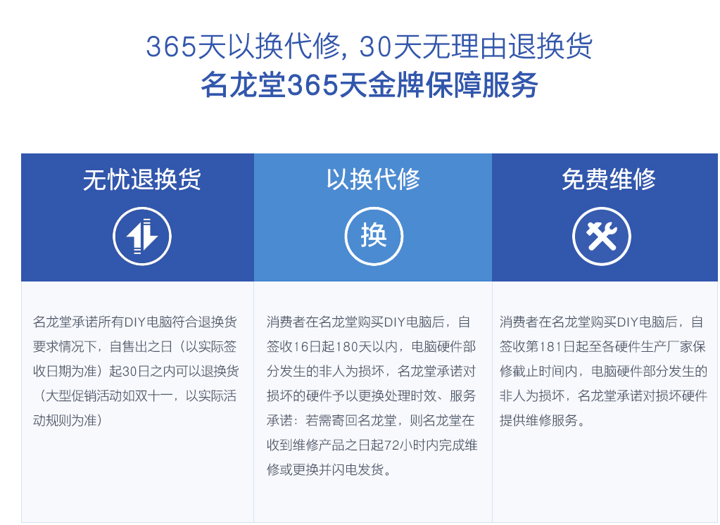 名龙堂在以高标准要求自己的同时也一直在为改善diy行业服务标准在不断努力,现在名龙堂更是diy服务标准的缔造者,强势推出365天全国联保上门服务,365天以换代修,30天无理由退换货完善电商DIY整机的售后服务,28900名工程师随时待命365天金牌保障只为你定制让你在名龙堂买的放心,用的舒心。