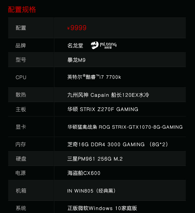 英特尔酷睿I7 7700K搭配最匹配的华硕Z270F GAMING主板,满满的心意让你安心超频;九州风神CAPAIN船长120水冷,轻松解救大功率发热;华硕猛禽站枭ROG STRIX-GTX1070-8G-GAMING玩家国度最高规格显卡,同档次更高的性能体验;芝奇16G DDR4 3000 GAMING显卡三星PM961 256G 的硬盘游戏载入零等待,数据传输不妥协;海盗船CX600的电源最强的动能供给;迎广805经典款机型霸气侧漏,一览无遗的典雅美。