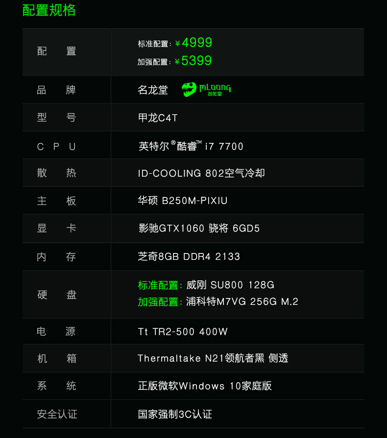 如果完全按照游戏的官方标准来说,配置一台全新的主机大约需要5K左右的价格,而名龙堂甲龙C4T就是专为这个价位玩家定制打造的游戏整机,该机采用了I7-7700处理器,四核八线程,搭配GTX1060 6G独立显卡,性能出色,确保为用户提供最佳游戏体验。8G容量DDR4内存和SAT3或者M.2固态硬盘可选,让这款高端游戏整机性能全面无明显短板,能流畅运行所有热门网络游戏,面对3A级单机大作也拥有不错的性能表现。
