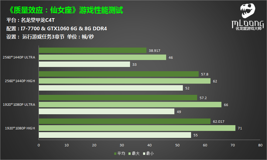 在实际的游戏测试中,名龙堂甲龙C4T可以流畅的运行《质量效应:仙女座》的游戏最高画质,在1080P的室内环境下帧数可以突破100帧/秒,而在比较复杂的室内场景,充满各种植被和雷鸣闪电与火线的第三章节流畅中,1080P的HIGH和ULTRA画质下均达到了平均57帧以上的绝对流畅水准,而在2K画质下,HIGH画质也可以达到了57的平均帧数,即便是2K ULTRA的变态画质也有38的平均帧,真正做到特效全开的游戏体验。