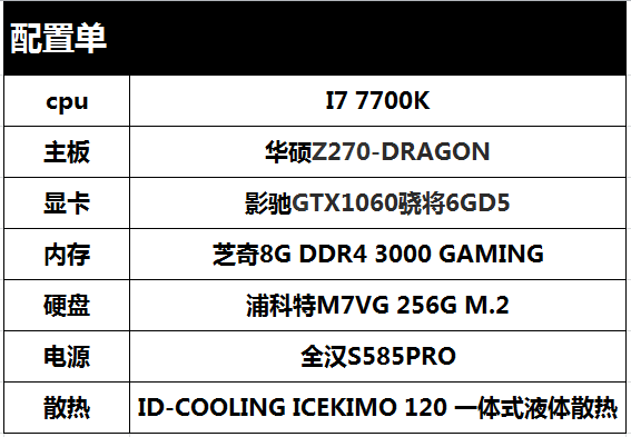 名龙堂甲龙C5处理器为全新KabyLake架构第七代英特尔处理器,将计算处理能力和功率全部提升40%,让响应更及时,操作更流畅,网络连接更迅速,现在还升级到 7700K对于喜欢超频的玩家来说无疑又是一个新的选择。华硕Z270-DRAGON主板搭配合理速度更快;影驰GTX1060骁将6GD5显卡强劲十足横扫主流游戏;芝奇8G DDR4 3000 GAMING内存让你多个任务同时处理丝毫不卡顿;浦科特M7VG 256G M.2加强版硬盘高速读取不等待;全汉S585PRO的电源稳定供电;采用ID-COOLING ICEKIMO 120 一体式液体散热,极大的保障了主机的寿命,低温低噪的游戏环境更加舒适如果你热爱游戏无论多么苛刻的游戏,名龙堂甲龙C5都可以摧毁它。