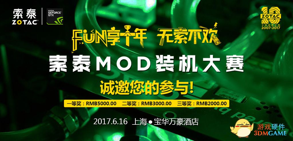 本次MOD装机大赛由索泰主办,2017年,是索泰中国10周年庆典,自2007年进入中国以来,索泰经过长达10年的耕耘,现已成为全球一线显卡品牌,NVIDIA全球AIC核心合作伙伴。从第一款8800GT明星产品到GTX 1080Ti PGF,索泰出色的产品品质和强大的研发和生产实力得到了玩家们的认可,不断的创新和超越给玩家们带来了许多的惊喜。创新是索泰的前进动力,也是显卡及DIY发展的动力,值此10周年之际,索泰特举办MOD装机大赛,彰显玩家个性,激发玩家创造力!