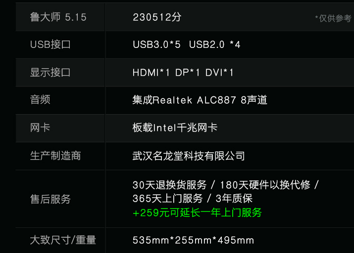 鲁大师跑分可以达到23万多,拥有5个USB3.0,4个USB2.0接口可以满足日常的基本需求,在售后上全国联保支持30天退换货,180天硬件以退代修,365天上门服务,三年质保,其它参数如下。