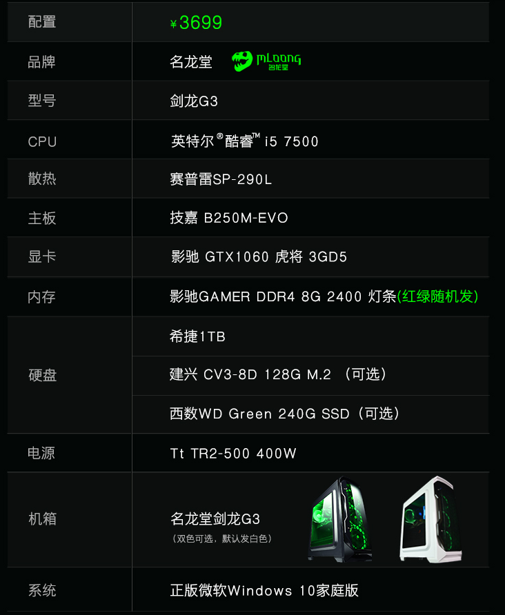 配置上面,这款剑龙G3搭载I5 7500处理器以及全新帕斯卡架构GTX1060,无惧大型游戏和多任务运行,均衡发力,得以最大限度的榨干整机全部性能。采用红或绿的呼吸灯GAMER DDR4内存优化频率和时序的配合最大程度的减少延迟响应慢的情况,加上4S间隙的呼吸灯动感无限,希捷1T的硬盘保障娱乐无忧还有建兴CV3-8D 128G或者西数WWD GREEN 240G 可供选择,400W Tt TR-500的电源稳定给力。对于追求性价比的朋友均衡搭配才是王道。