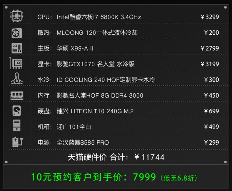 配置方面名龙堂剑龙GM7标配至尊六核I7-6800K,搭配华硕X99-A高规大板性能强劲接口功能丰富;显卡采用影驰名人堂GTX1070水冷定制版玩转游戏2K全特效毫无压力而且低温静音;内存同样使用了影驰的名人堂8GB DDR4 3000MHZ高频内存,配合建兴T10 240GB M.2固态硬盘体验超快读写反映速度;配合最新迎广101全白机箱展现不一样的纯白信仰体验。
