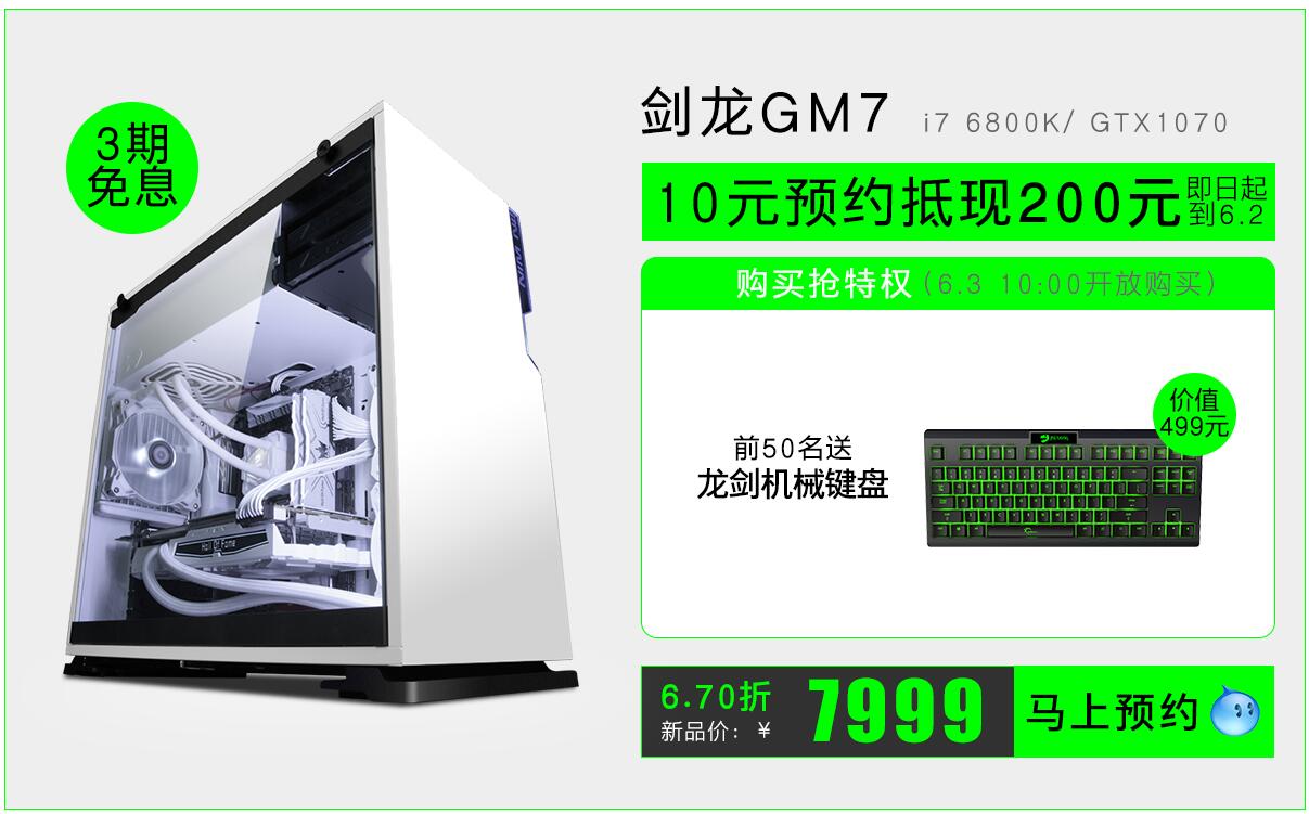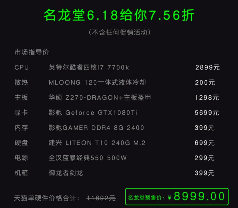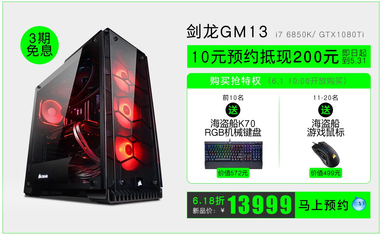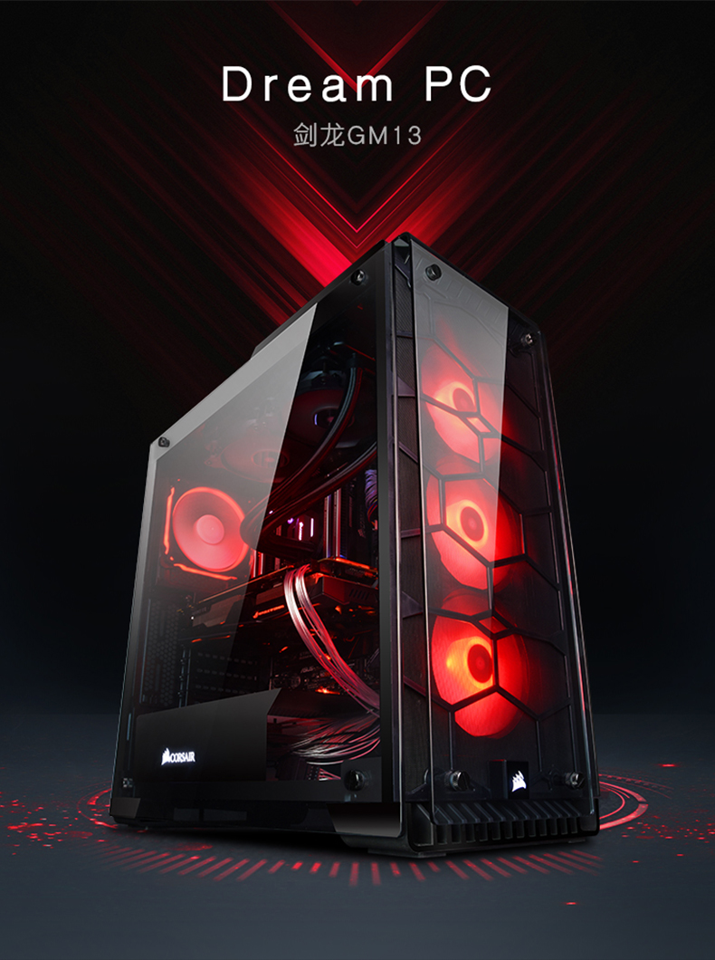 作为名龙堂618新机预售的压轴神机,剑龙GM13几乎代表一个游戏玩家的终极梦想:海盗船机箱和水冷、RM系列模组电源+白金统治者内存;华硕ROG国度的X99主板与GTX1080TI显卡加上I7-6850K处理器的华丽阵容,无论是品牌、性能还是外观上都让人无可挑剔,再配上一把海盗船K70 RGB机械键盘和鼠标,极致豪华、极致享受!