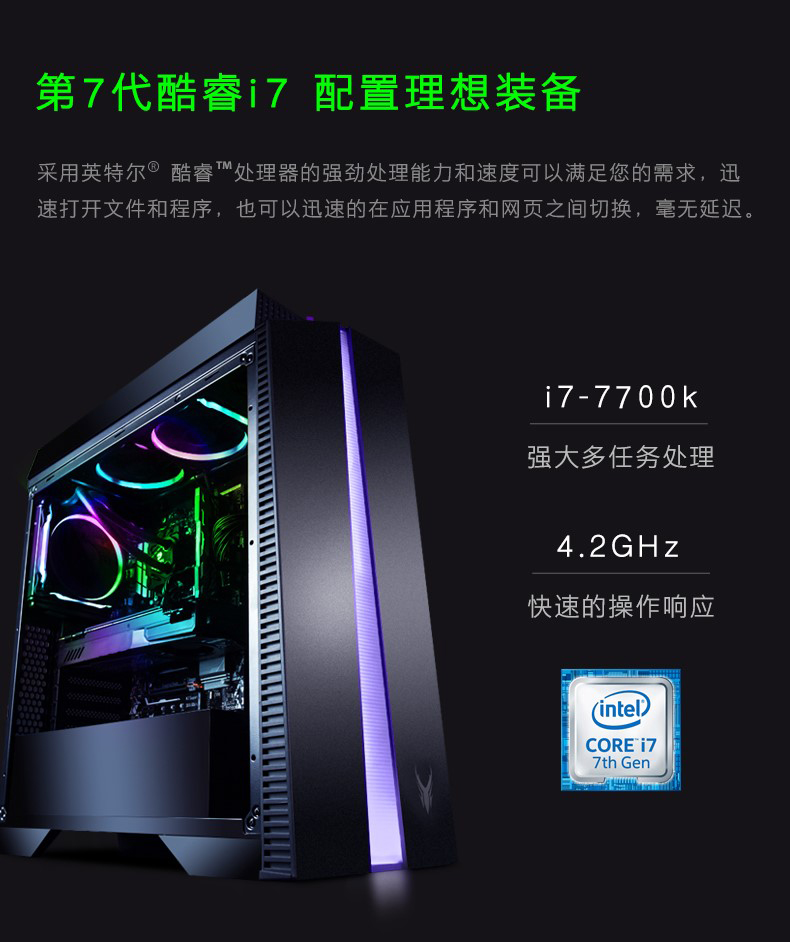 外观都能媲美暴龙系列,性能更是强悍。CPU方面,名龙堂酷睿i7-7700k是Intel为高端用户推出的最新旗舰处理器,基于Kaby Lake架构,采用最新的14纳米制作工艺。单从性能和功耗来说,最新一代的旗舰处理器得到了一定幅度的提升和优化,支持超频,内置HD 630核心显卡,热功耗设计为91W。总而言之这款处理器可以在大型单机游戏表现非常出色。