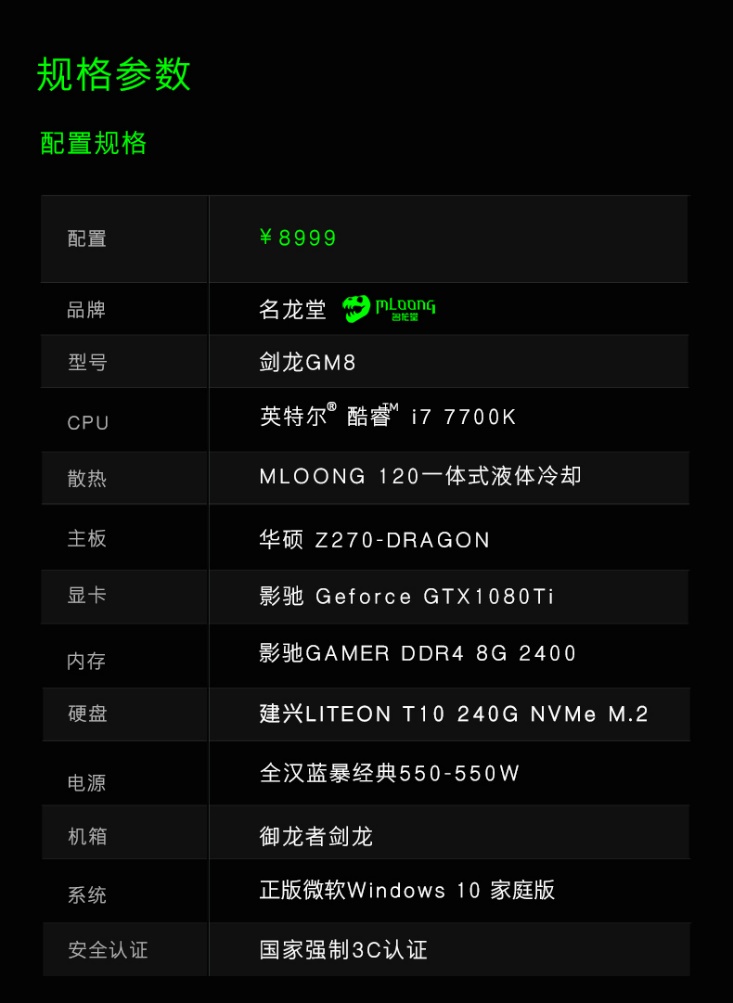 电竞狂舞的世界里容不得小编在这娓娓道来,还不如甩上配置表来的直接爽快。相信各位看官不费吹灰之力就已经知道这台剑龙GM8物超所值。对颜值还有更高的追求的玩家更可以联系名龙堂专业的测试工程师,满足你精益求精的态度。