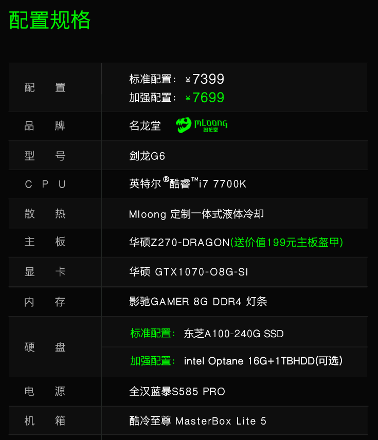 选用英特尔酷睿I7系的7700K,带K支持安心超频赋予你更高的游戏追求;华硕Z270-DARGON一线大牌主板最有力的平台支持省心省事;华硕GTX1070-O8G-SI的显卡挑战大型游戏毫不费力;影驰GAMER 8G DDR4 灯条版的内存;东芝A100-240G SSD 的硬盘足够大的空间来存放你的热情同时灯光的加入让硬件好玩又有趣;全汉蓝暴S585 PRO的电源稳定供能。化整为零所有硬件分开来看件件优越,最难得的是经过名龙堂设计师的精心挑选苛刻的测试让组合起来的他们发生了一加一大于二的效果。