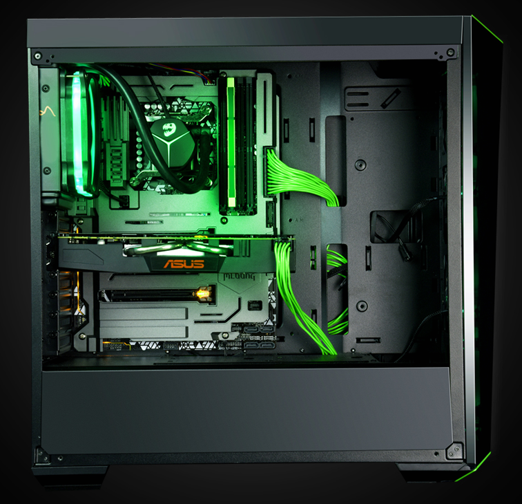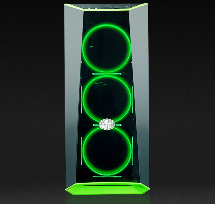 不管是异型的机箱设计,还是黑绿的颜色搭配又或是玻璃和钢板的材质结合,无一不遵循简约但不简单的设计理念,处处细节透露出精致,高透光的磨镜面板是立体的等腰梯体下面就是三个炫光风扇,当风扇转动流光溢彩。