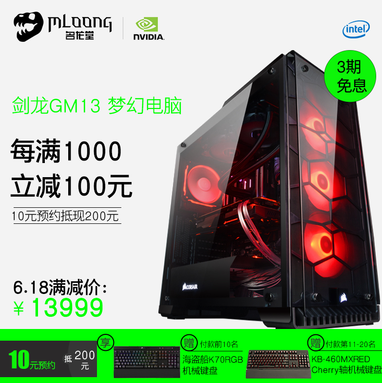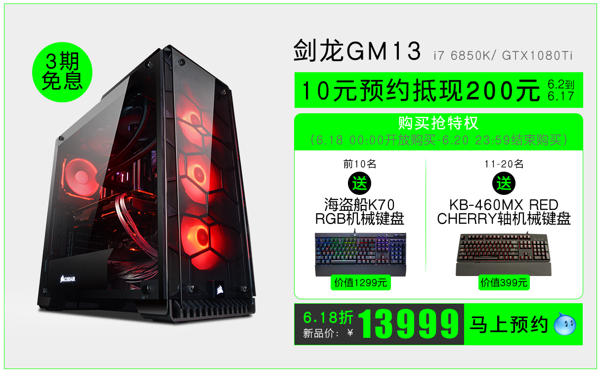 年中之猫狗大战即将到达巅峰,我们这些渔翁就等着捡便宜吧。名龙堂在618决定发福利,实力提高你理想生活的品质。这次名龙堂也下血本打造性价比高还兼备信仰的神器——剑龙GM13,现在预约10元抵现金200元,并且三期免息加送价值最高上千元的配件,直击电竞发烧友的心之所向,势不可挡。