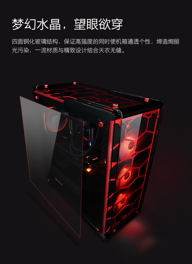 世间形容集美貌智慧于一身的莫过于此。四面被钢化玻璃围绕保证了高强度并且通透感,点线结合造就了超强设计感,搭配灯光的渲染发挥得淋漓尽致,材质和设计到达了完美契合得状态。前面板的三副风扇设计更是率先夺得眼球,玩家可根据自己对梦幻追求定制自己的神秘之光。Diret Airflow技术保证高效散热,同时采用可拆卸防尘网设计,清理不再是难事。