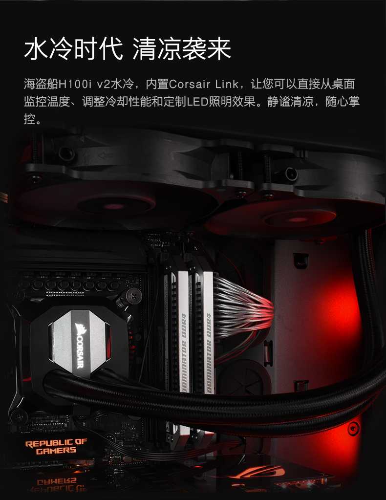 甄选海盗船H100i v2水冷,内置Corsair Link,随心所谓的掌控温度性能。240mm的散热器提供双倍的散热动力,超频性能下提供出色的散热效果。