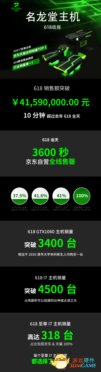 通过数据不难发现,618中越是高端主机玩家最青睐名龙堂,至尊高端主机甚至只选名龙堂!主要原因就是名龙堂的研发人员了解什么才是玩家想要的!高性能、有个性再加上一些独特的MOD定制,充分满足玩家对PC的梦想。