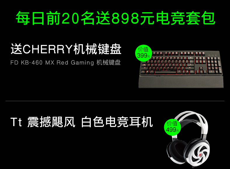 现在每天前20名还送898元的电竞套包,价值399的CHERRY机械键盘和价值499的Tt震撼飓风 白色电竞耳机等你来拿,所以还没入手的朋友快点动起来吧!名龙堂剑龙G6你值得拥有。