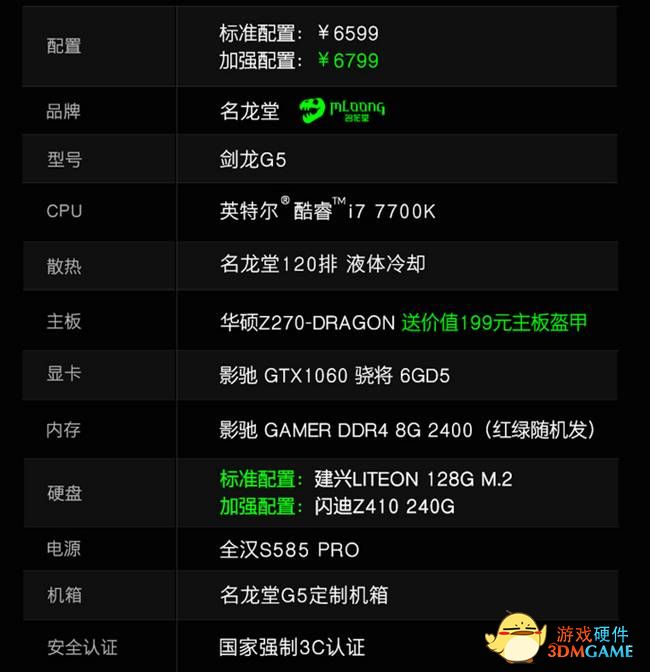 自己组装机子,首先攒机就是一条漫漫长路,加之之后的组装还有可能出现各种的不兼容,毕竟不是老司机还真的玩不了DIY,但买整机就不一样了,用超省的价格得到梦寐以求的配置,这台G5就是绝对的性价比冠军,英特尔酷睿I7-7700K处理器与华硕Z270芯片组搭配,让你在游戏里尽情暴击;索泰GTX1060-6GD5 GAMING PLUS OC 独立显卡全新架构搭配影驰GAMER DDR4 8G 2400的内存,建兴256G M.2 SSD的硬盘,满足日常生活娱乐一切需求,全汉S584 PRO的电源,稳定供电质量保证。