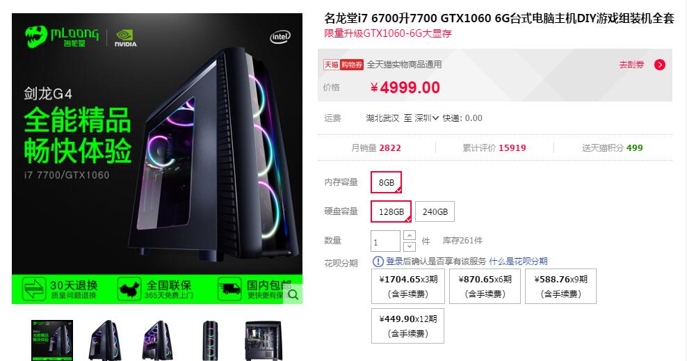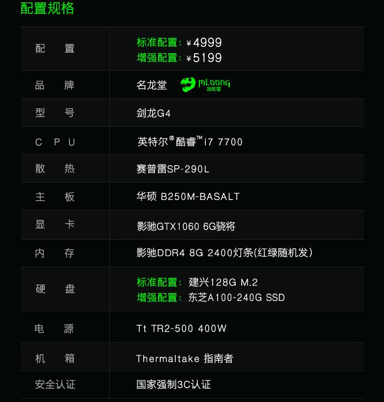 如果按照游戏官方给的配置图自己去组装一台整机,也差不多要几k。而名龙堂剑龙G4就是一款专门为玩家打造的游戏整机。该机采用了I7-7700处理器,四核八线程,搭配GTX1060 6G独立显卡,性能出色,确保为用户提供最佳游戏体验。这款整机整体没有什么短板,可以畅玩所有热门网络游戏,面对3A级单机大作也拥有不错的性能表现。