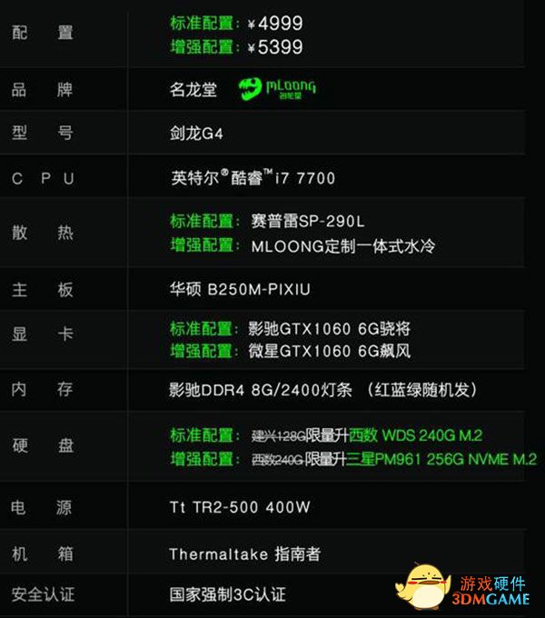 从配置单看,名龙堂剑龙G4搭载了i7 7700处理器,主频3.6GHz,最大睿频可达到4.2GHz,强大的处理器可以满足目前的运行转换,应用来回切换也不卡顿,处理速度非常快。显卡方面,标准配置是影驰GTX1060 6G大将,核心频率1544/1759MHz,显存频率8000MHz,显存容量6GB,显存位宽192bit。1060显卡性能也是非常强大,玩游戏高流畅度的画面能让玩家大胆的进行厮杀,就算是特效全开,也是能轻轻松松应付。主板是采用了华硕B250M-PIXIU,众所周知,华硕是一线大品牌,产品还是很有保障的。