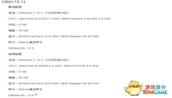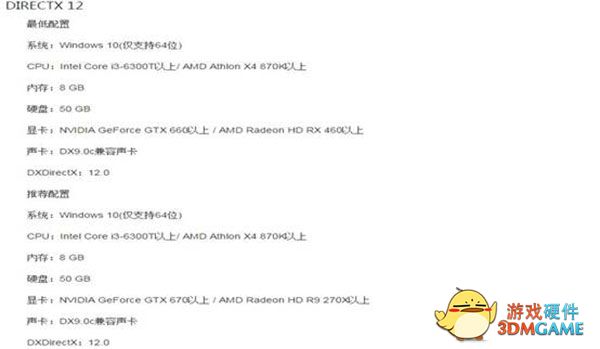 根据官方的配置单,DIRECCTX 12环境下,推荐配置需要i3-6300T以上,显卡则需要GTX670以上,整体的要求不算高,毕竟所需要的CPU和显卡都是好几年的的硬件了,经过了这几年,现在的硬件的平均性能远远不止这个水平。