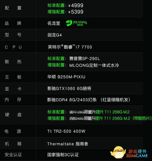 剑龙G4搭载了英特尔酷睿i7 7700处理器,主频高达3.6GHz,四核心八线程,在游戏过程中,切换人物自如,运算速度极快。显卡采用影驰GTX 1060 6G骁将,核心频率1519/1734MHz,显存频率8000MHz,在高画质的场景下,能够很好的应付,让你在虚拟球场上场尽情的自由发挥极致操作。华硕B250M-PIXIU主板,影驰DDR4 8G/2400灯条内存,建兴 T11 256G M.2,整体的硬件搭配在一起,性能已经远超一般主流PC的水平。